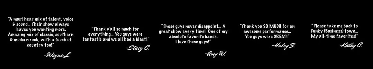 Our song includes favorite songs from such diverse artists as Journey, The Rolling Stones, The Eagles, Van Halen, The Black Crowes, Stevie Wonder, The Commodores, Stevie Ray Vaughn, Toto, Tom Petty, Aerosmith, Loverboy, John Cougar, Def Leppard, Lynyrd Skynyrd, Bad Company, 38 Special, Georgia Satellites, Bon Jovi, Bryan Adams, Chris Stapleton, Alabama, Jason Aldean… And many more!